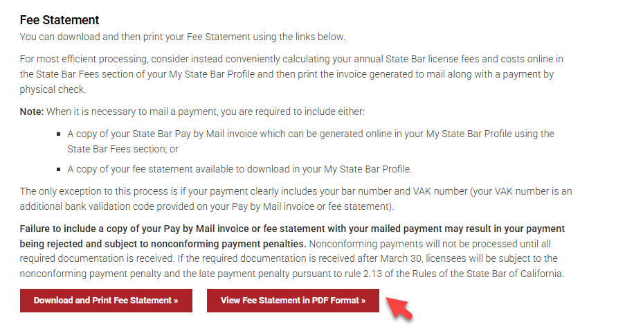 A current year fee statement is available to download and print in your My State Bar Profile.