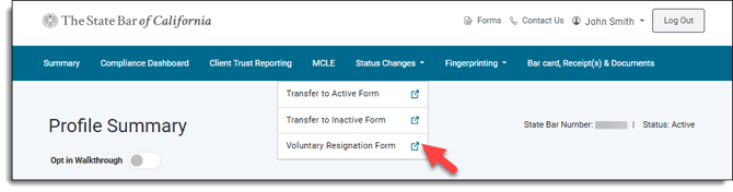 If you would like to voluntarily resign, log in to your My State Bar Profile and click the "Voluntary Resignation Form" option under the "Status Changes" menu to access and complete the required form.