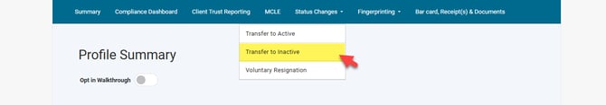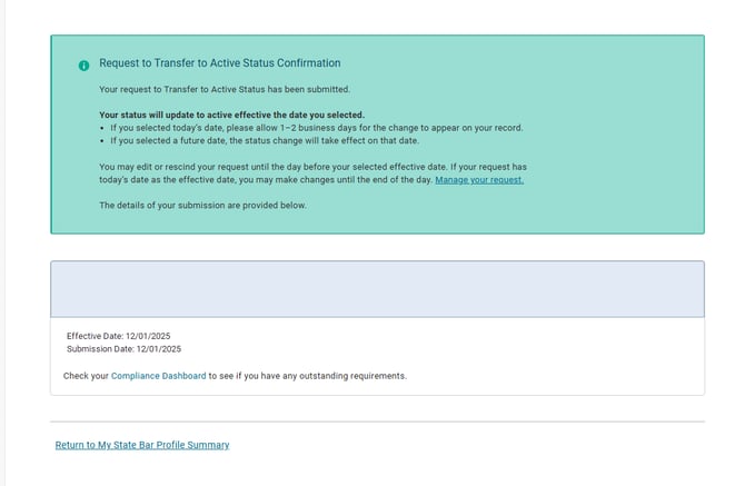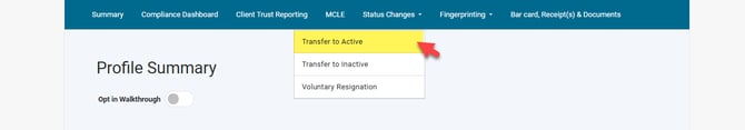 If you are currently on voluntary inactive status and wish to transfer to active, your transfer to active request must be submitted online through My State Bar Profile.