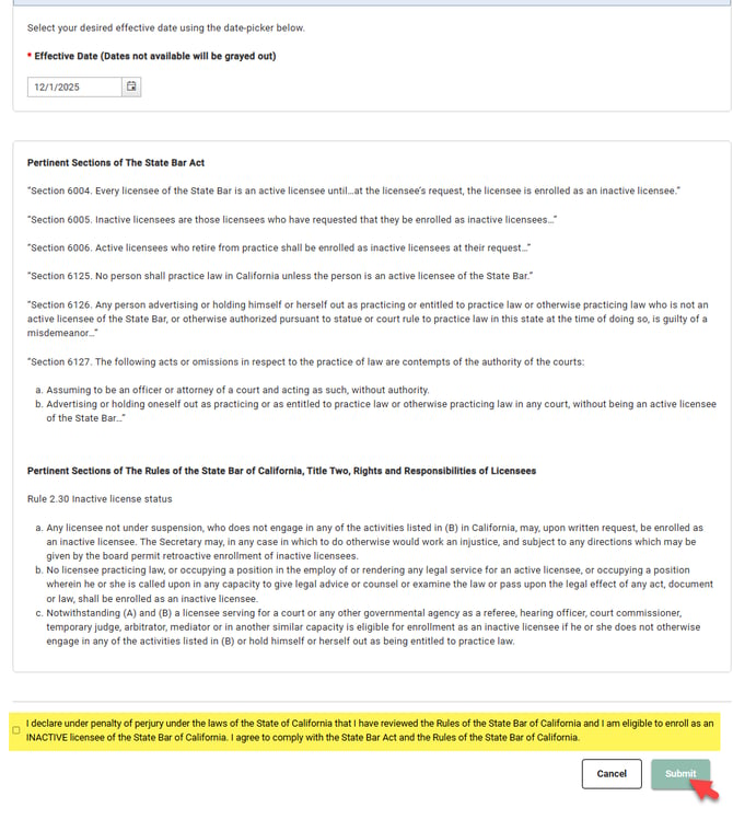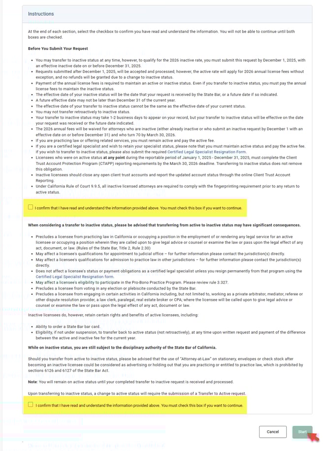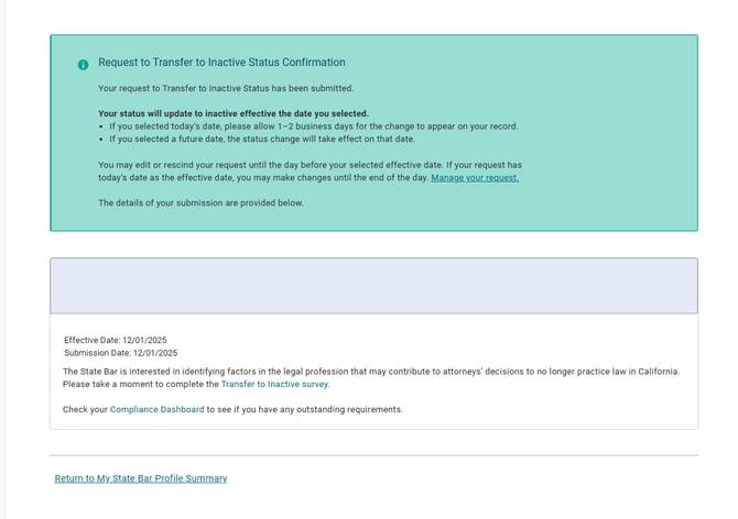 - To have your 2026 annual fees calculated at the lower inactive rate, you must submit your transfer to inactive request online through My State Bar Profile by December 1, 2025.