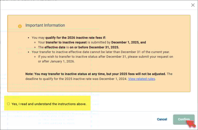 - The effective date of the transfer to inactive must be on or before December 31, 2025, to qualify for the 2026 inactive fee.
