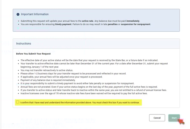Check the box confirming you have read and understand the instructions. Click “Start” to continue.