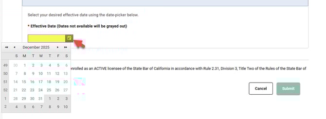 Your effective date cannot be backdated or set beyond December 31 of the current year. If you wish to transfer to inactive status after December 31, please submit your request on or after January 1 of the following year.
