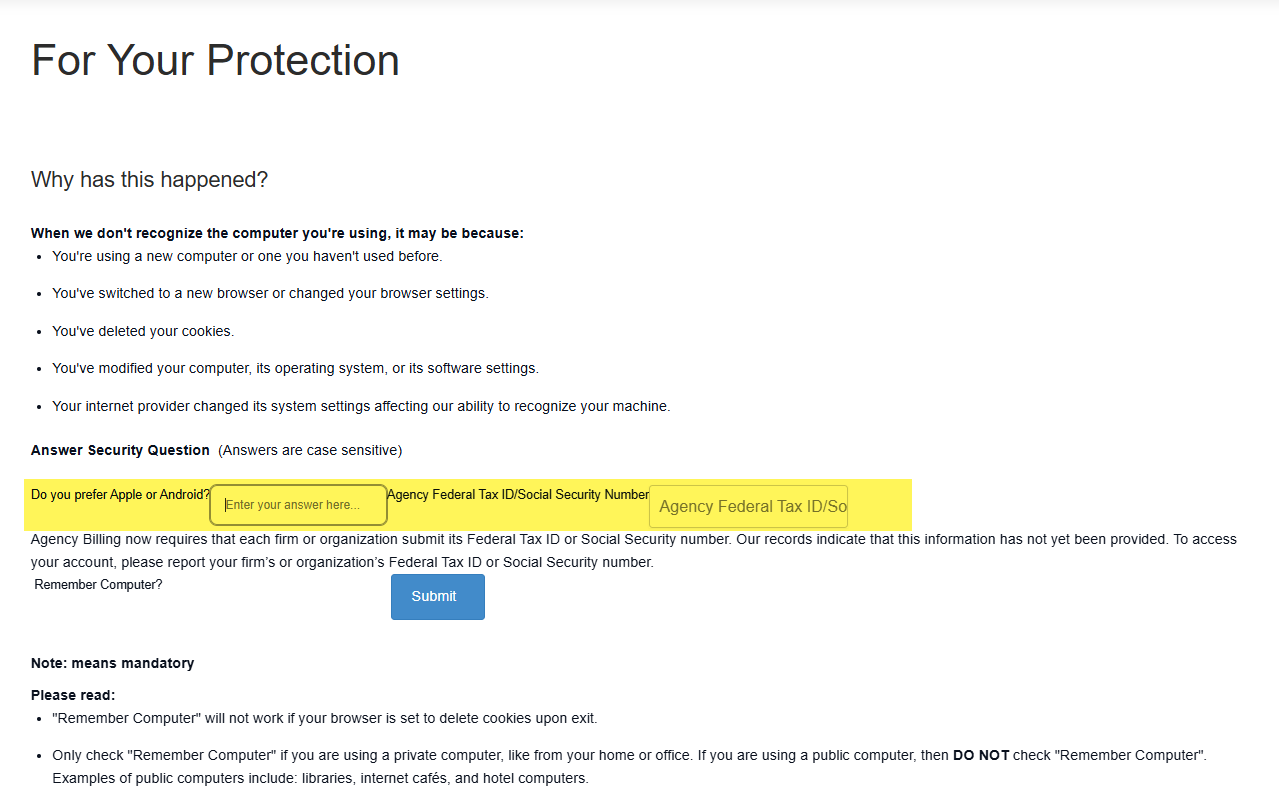 After entering your Sign In Account name and password, you will be prompted to answer one of your previously established security questions and provide the firm's or organization's Federal Tax ID or Social Security number.
