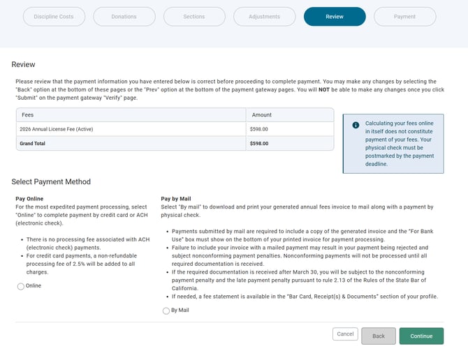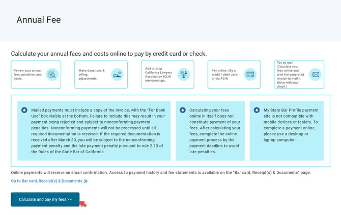 Payment of your annual fees and/or costs can be completed online through My State Bar Profile as part of the Attorney Annual Renewal.