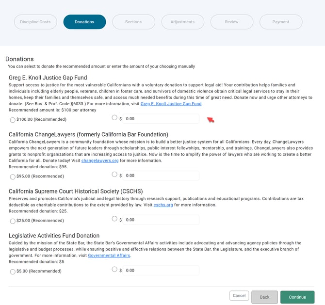 You are required to make a selection of zero or another amount for each optional donation before leaving the "Donations" page.