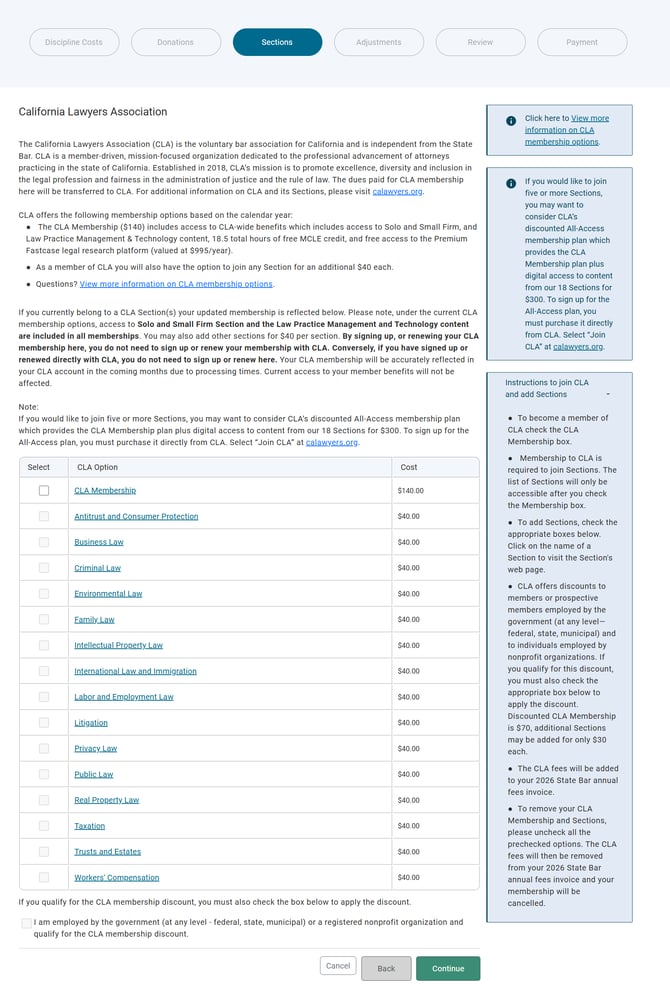 Next, the "Sections" page allows you to add a California Lawyers Association (CLA) membership and Section. If you are currently a CLA member your membership will be preselected for you. Make your selection and click "Continue" to proceed.