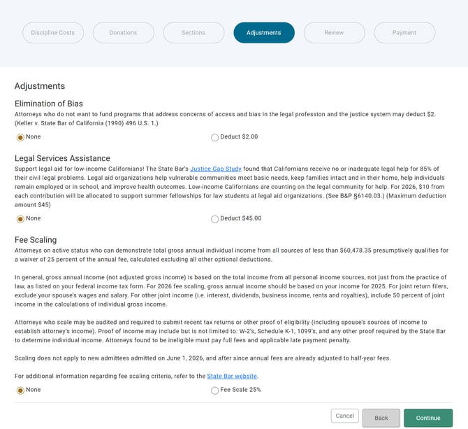 Next, the "Adjustments" page allows you to take available optional deductions and apply for fee scaling (if applicable). Make your selection and click "Continue" to proceed.