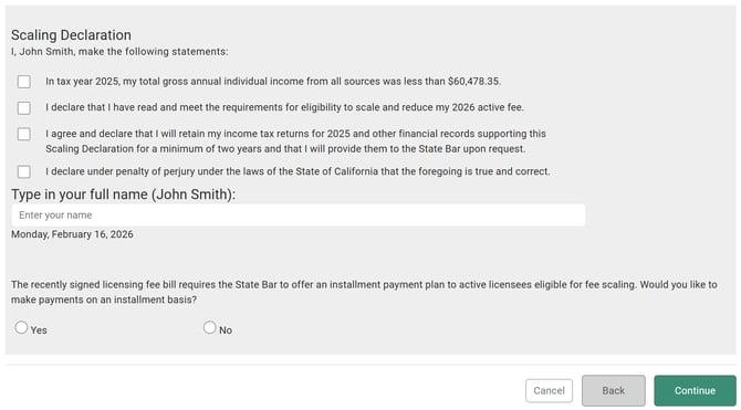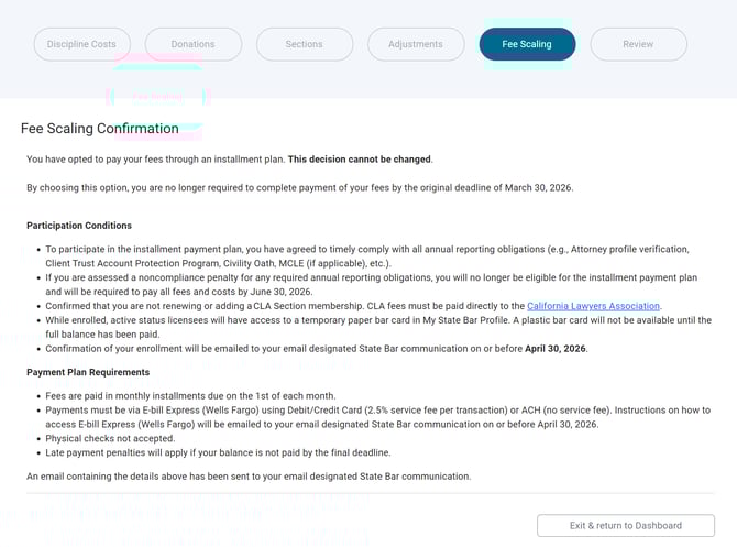 As part of your Fee Scaling Declaration, you must also indicate if you would like to make payments on an installment basis. If you opt to make payments on an installment basis, you will be asked to confirm your decision before it is finalized.