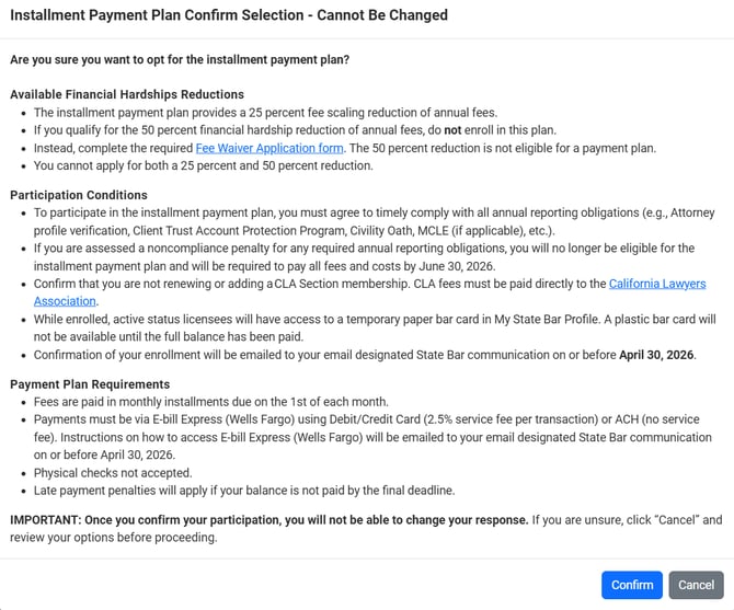 Note: Once you confirm your participation, you will not be able to change your response. Additionally, if you are assessed a noncompliance penalty for any required annual reporting obligations, you will no longer be eligible for the installment payment plan and will be required to pay all fees and costs by June 30, 2026.