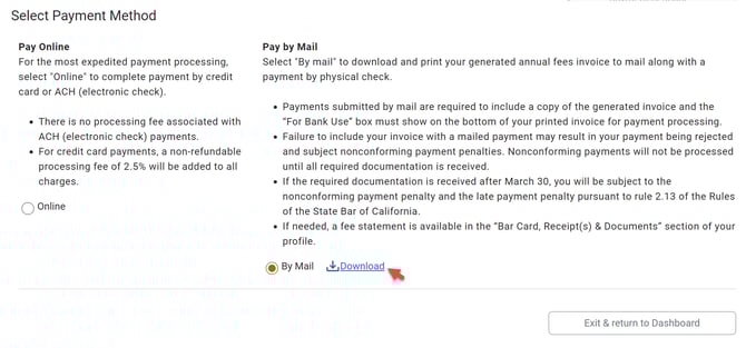 To generate an invoice and submit a payment by mail, select "By Mail" and download the generated invoice. Once you have downloaded your invoice, click "Exit & return to Dashboard."