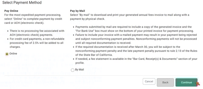To complete a payment online, select "Online" and click "Continue" to access the State Bar's online payment portal.