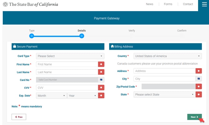 Enter the required information for the payment method selected and click "Next" to proceed.