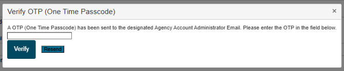 A one-time passcode will be sent to the email address entered for the Agency Account Administrator.