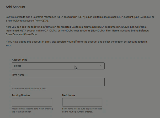- Select the account type (IOLTA, non-CA IOLTA, or non-IOLTA).