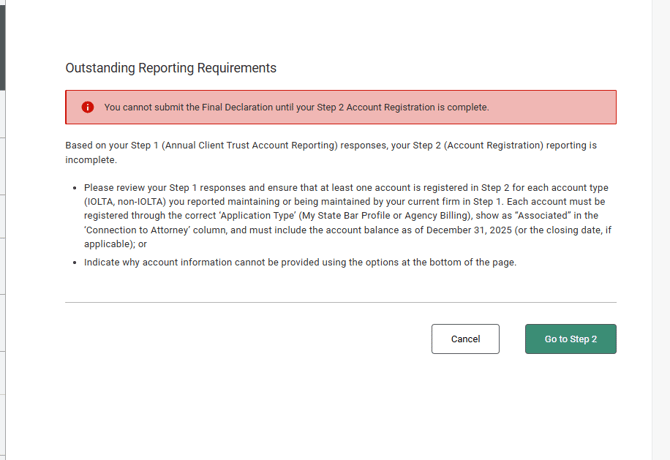 You will not be able to submit the Final Declaration if, based on your Step 1 responses, required accounts have not been registered, or if you have not indicated in Step 2 why the account information cannot be provided.