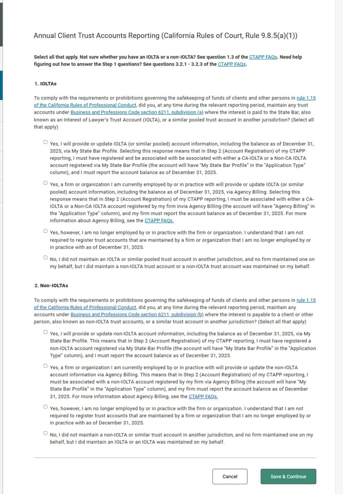 Step 1 requires you to respond to two reporting questions about whether you maintained, or your firm maintained on your behalf, IOLTAs and/or non-IOLTAs during the reporting period. Select applicable options and click "Save & Continue" to proceed.