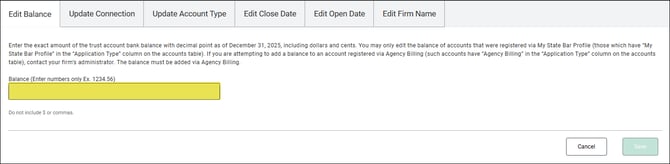 Next, a pop-up will appear with your options, on the "Edit Balance" tab, enter the required account ending balance as of December 31, 2025 and then click the "Save" button to register the information for the selected account.