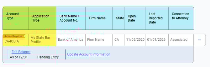 - If you maintained the IOLTA account and you selected that you would provide required account information via My State Bar Profile, a CA-IOLTA or Non-CA IOLTA account must be registered through My State Bar Profile with the December 31 ending balance reported. Your firm cannot report this information on your behalf via Agency Billing.