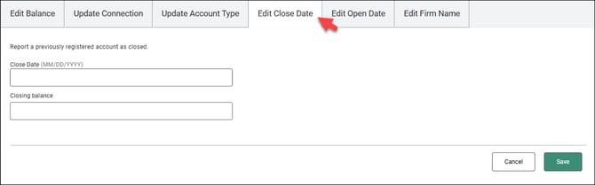 On the "Edit Close Date" tab, enter the date the account was closed and the account balance on date account was closed.