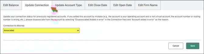 Note: If you added an account in error, you can also use the "Connection to Attorney" option to indicate that the account was added in error and should be disassociated.