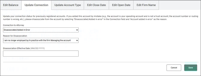 If you need to report that you are no longer associated to an account, either because the account was transferred to another attorney or you are no longer affiliated with the firm that reported the account on your behalf, you can report the disassociation by updating the "Connection to Attorney" status to disassociated.
