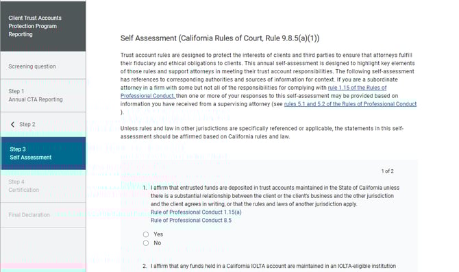 Step 3, if applicable, requires you to complete an annual self-assessment of client trust account management practices. Links to corresponding authorities and sources of information are provided for context.