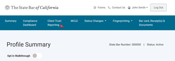 From the main navigation bar at the top of your My State Bar Profile Summary page, select “Client Trust Reporting.”