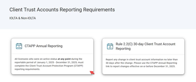 On the "Client Trust Accounts Reporting Requirements" landing page, click the "CTAPP Annual Reporting" option to begin your reporting.