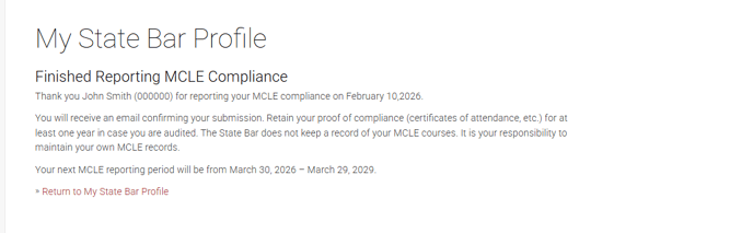 A confirmation page will display once your compliance is successfully submitted. A confirmation email will also be sent to your email address on record for State Bar communications.