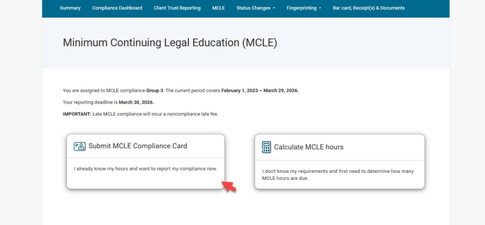 On the Minimum Continuing Legal Education (MCLE) landing page, select "Submit MCLE Compliance Card" to begin reporting your compliance online.