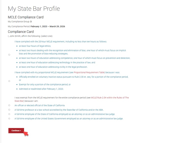 Review your MCLE Compliance Card reporting options, select the applicable option, and click "Continue" to review and confirm your information prior to final submission.