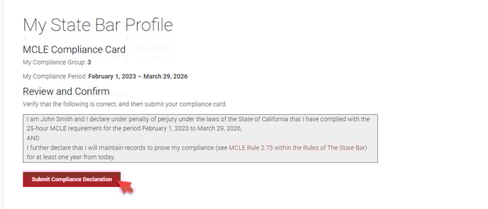 Review your MCLE Compliance Card, then click "Submit Compliance Declaration" to complete your MCLE compliance reporting.
