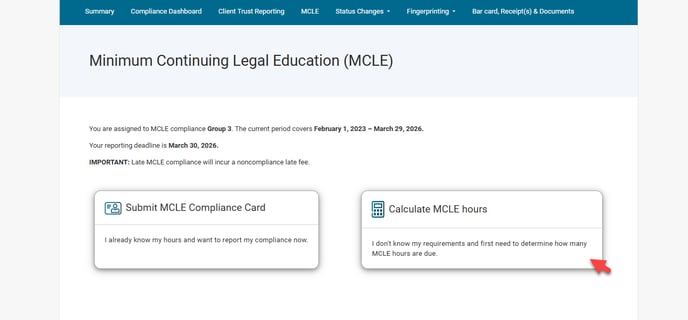 Note: Only licensees in the current reporting MCLE compliance group are able to access the MCLE compliance card and report MCLE compliance. The MCLE compliance card is not available for licensees in MCLE groups that are not currently required to report.