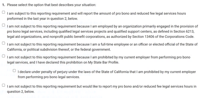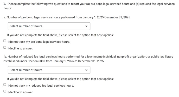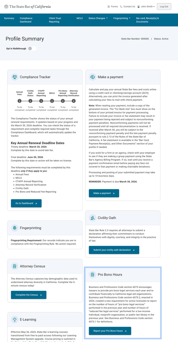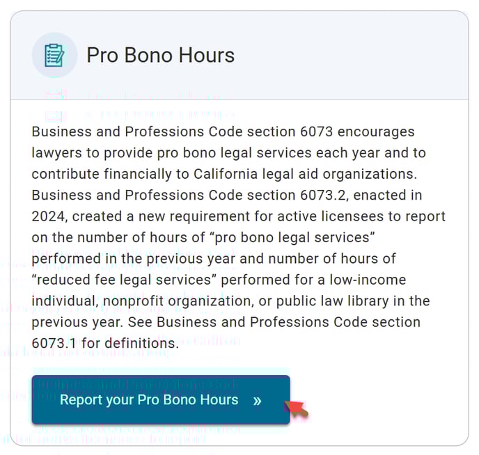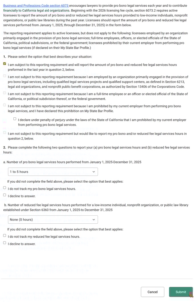 Beginning in 2026, licensees must report their pro bono and reduced fee legal services hours. This requirement is completed as part of the Attorney Annual Renewal and must be submitted online through My State Bar Profile.