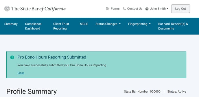 After submission, a confirmation message will appear on your My State Bar Profile Summary page.
