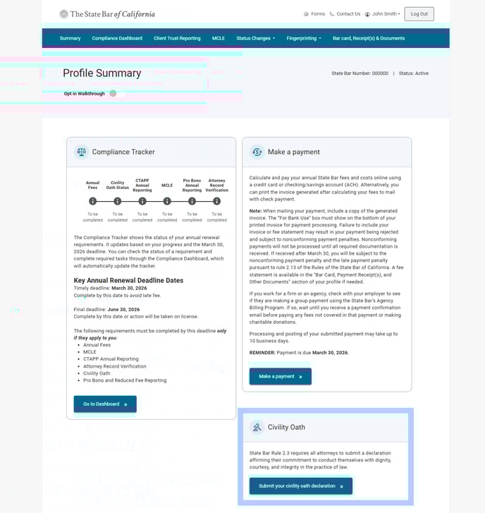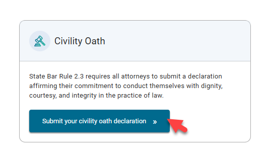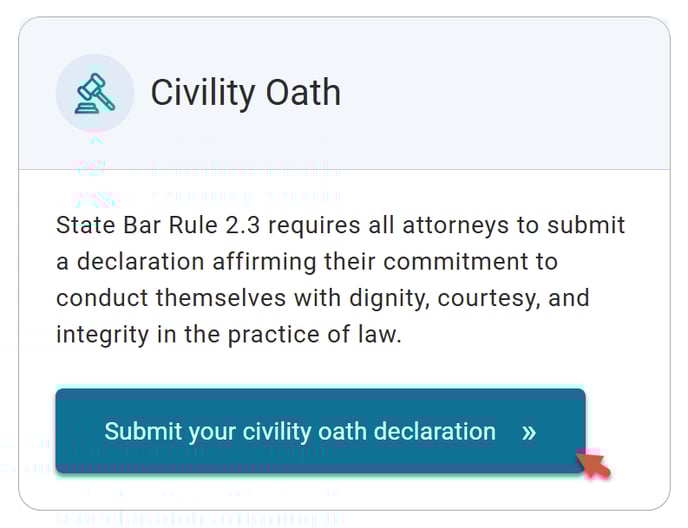 Beginning in 2026, licensees must submit an annual civility oath declaration confirming adherence to the attorney oath. This requirement is completed as part of the Attorney Annual Renewal and must be submitted online through My State Bar Profile.