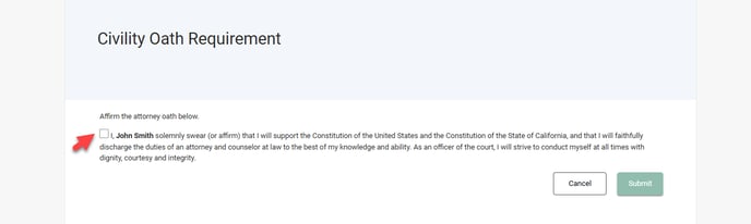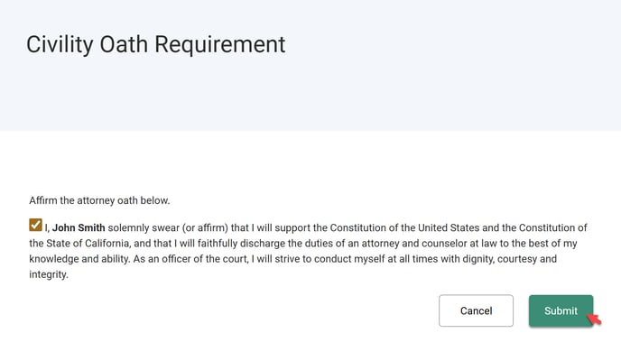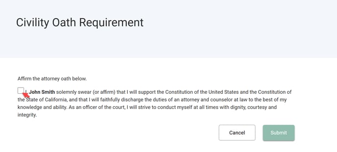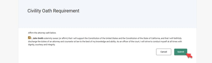 Review the attorney oath and check the box to affirm it. Once checked, the “Submit” button will be enabled.